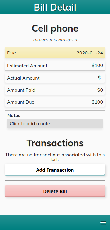Navigating and using the application is straightforward. Tapping a bill or budget brings up the details page which lists all relevant information. The user may also add a new transaction directly from this page, or they can bring up the hamburger menu at any time for a listing of actions available.